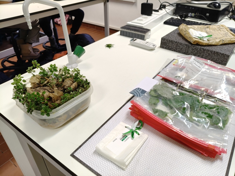 Esta sessão incidiu na apresentação de plantas aromáticas, sendo explorada a folha de cada planta, para identificação e distinção principalmente através do sentido do olfato, complementada com a construção de um herbário.