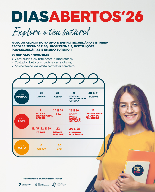 Recorde-se que nos próximos dias 10, 11 e 12 de março terá lugar a Feira do Ensino Secundário, promovida pelo Município de Famalicão e dirigida a alunos do 9º ano de escolaridade, que vai reunir, no Famalicão IN Hub, em Vale São Cosme, cerca de 13 instituições de ensino que vão apresentar um leque de 39 cursos (científico-humanísticos e profissionais) em áreas que vão das Artes e Design às Tecnologias de Metalomecânica, Informática, Saúde e Apoio à Gestão.