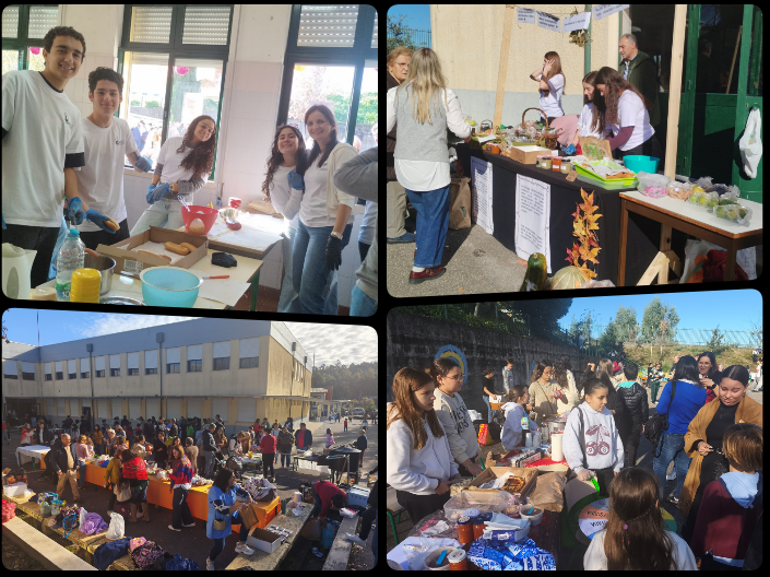Desde cedo, alunos, professores, funcionários e famílias encheram o recreio para participar no tradicional magusto, ao qual se juntaram diversas atividades que enriqueceram o convívio. O dia soalheiro, o aroma das castanhas assadas misturava-se com o cheiro apetitoso das bifanas, papas de sarrabulho e de outras iguarias regionais, preparadas com dedicação pelos intervenientes. Para além destes sabores típicos, destacou-se a presença dos alunos finalistas, que trouxeram uma marca verdadeiramente distintiva à celebração: envergavam t-shirts, exibindo a imagem da “Rainha Patrona do Agrupamento”, símbolo de identidade, união e orgulho escolar. A sua participação ativa trouxe cor, energia e um sentimento especial de pertença.