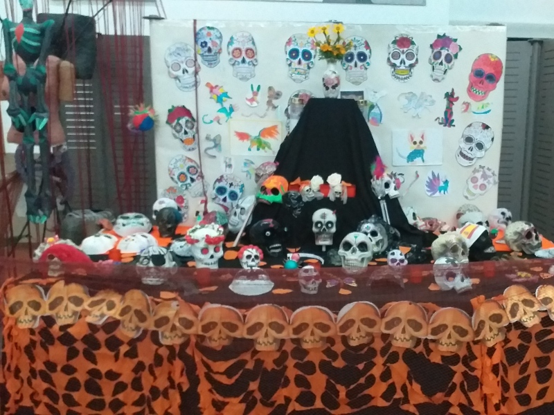Para dar cumprimento ao Plano Anual de Atividades proposto pelo grupo disciplinar de espanhol, na primeira semana de novembro, os alunos do 7.º ano realizaram uma exposição, no polivalente da Escola, com um pequeno altar, alebrijes, caveiras e objetos relacionados com o “Día de los Muertos”, no México.