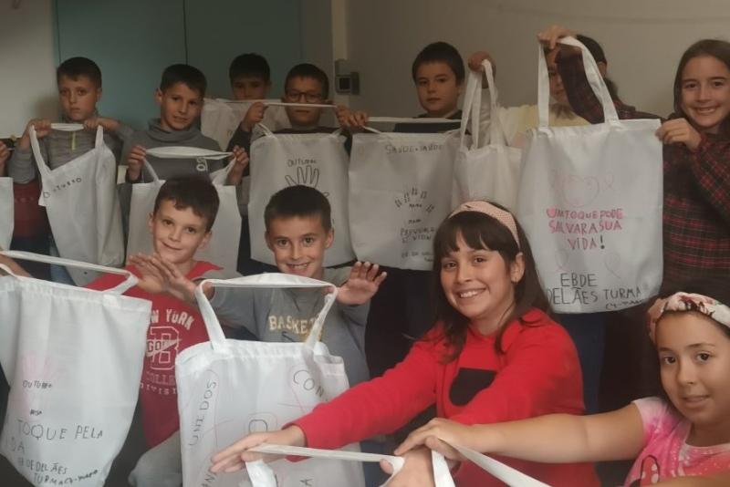Saúde e Ambiente, unidos na Prevenção na Escola Básica de Delães, com os alunos da Turma do 4º ano da Escola Básica de Delães a refletiram sobre a importância da prevenção e diagnóstico do cancro da mama e promoveram a sensibilização da comunidade com a inscrição de mensagens de consciencialização, em sacos ecológicos.