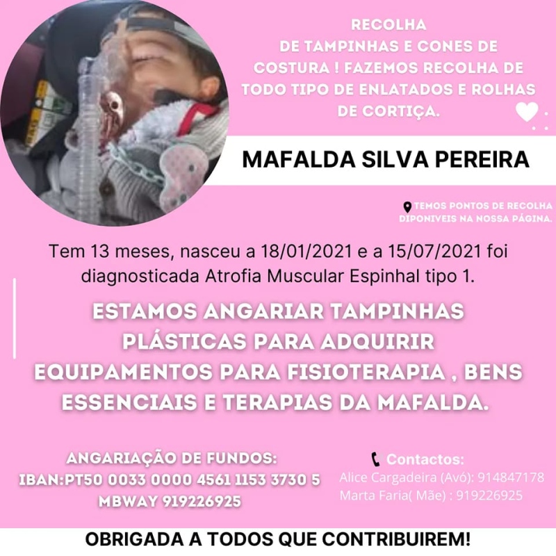 O Clube de Coolaboradores está a desenvolver uma iniciativa de apoio e solidariedade, que consiste na angariação de materiais - tampinhas, latas, cones de costura, rolhas de cortiça – que possibilitam ajudar a pequena Mafalda, uma menina diagnosticada com Atrofia Muscular Espinhal tipo 1, a conseguir pagar os tratamentos que lhe possibilitarão melhores condições de saúde e de vida.