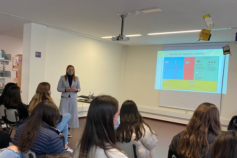 Os alunos do terceiro ano dos cursos técnicos de contabilidade e comercial da Escola D.Sancho I estiveram à conversa com Catarina Carvalho, gestora de projetos do gabinete Famalicão MadeIN, para debater o empreendedorismo e como empreender nos dias de hoje.