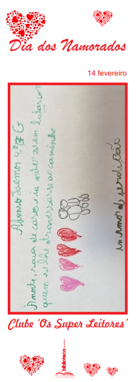 Ler maisNas sessões do Clube de Leitura, “os Super Leitores” do 3º e 4º Ano dedicaram-se à leitura de vários livros da Biblioteca que versavam o amor e a amizade para selecionarem a frase que mais os cativou e transcreverem-na para um marcador de livros.