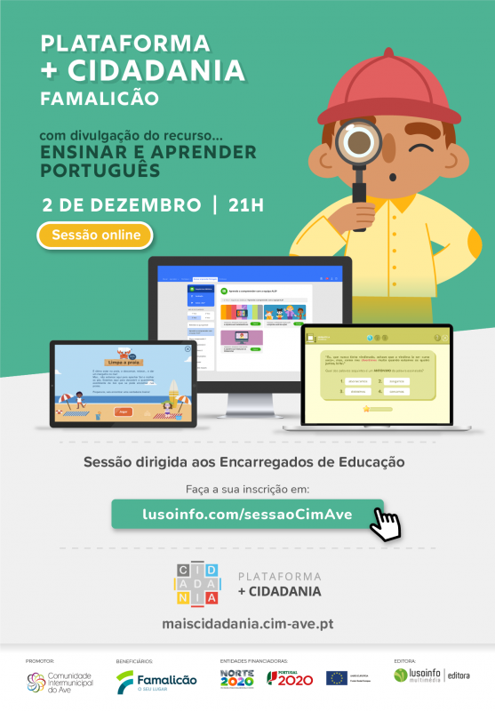 Ler maisO município de Vila Nova de Famalicão disponibiliza a Plataforma +Cidadania https://maiscidadania.cim-ave.pt/ a toda a comunidade educativa desde o pré-escolar ao 1.º ciclo do ensino básico. Convida-se os Encarregados de Educação para participar na sessão “Plataforma +Cidadania”, a realizar no dia 2 de dezembro, às 21 horas, com a duração aproximada de 60 minutos.