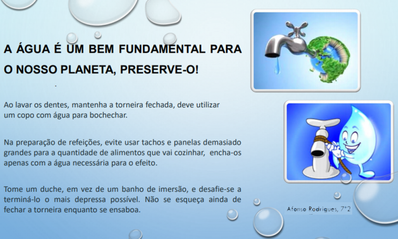 A água é um bem essencial e escasso. É urgente preservá-la e regrar o seu consumo economizando o mais possível. Esta foi a conclusão a que os alunos da escola de Bairro chegaram após a realização de diferentes trabalhos e pesquisas. A água é fonte de vida!