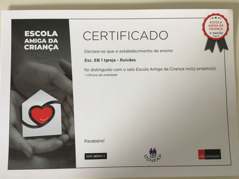 A EB de Ruivães foi distinguida com o selo Escola Amiga da Criança, no projeto “Oficina da Oralidade”.